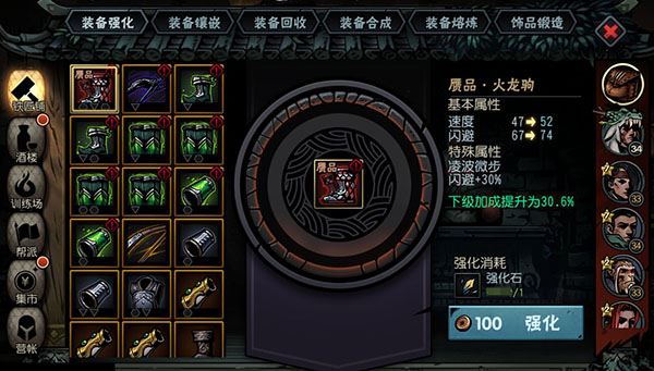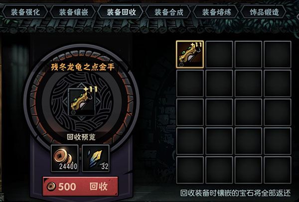装备回收可将已强化的装备进行回收,系统会返还部分铜钱和强化石,装备上镶嵌的宝石会全部返还。