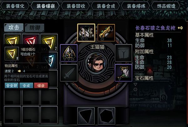 宝石镶嵌可以将对应属性的宝石嵌入有孔位的装备中,目前宝石分为攻击和防御两种。宝石支持合成,等级越高,属性效果越明显。