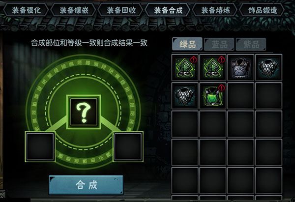 装备合成功能可以将低品质装备合成为高品质装备,白品合成绿品,绿品合成蓝品,蓝品再合成紫品。对应数量分别为:2件白品合成1件绿品,3件绿品合成1件蓝品,4件蓝品合成1件紫品。