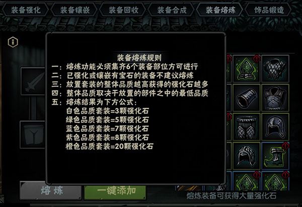 装备熔炼需要集齐6件套装部件,不同品质套装可获得不同数量的强化石:白色3颗、绿色5颗、蓝色7颗、紫色8颗、橙色20颗。