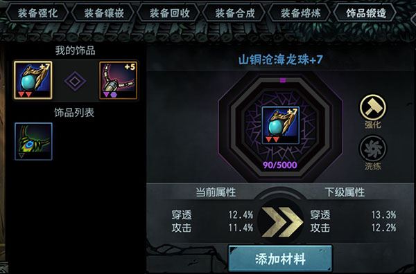 饰品锻造支持强化和洗练,强化时需要点金石和消耗装备。点金石可通过帮派BOSS战获得,也能通过购买或活动获取,消耗装备则直接用于提升饰品等级。
